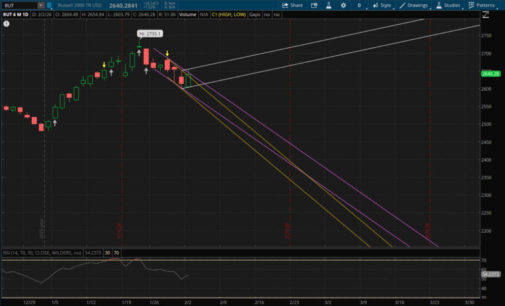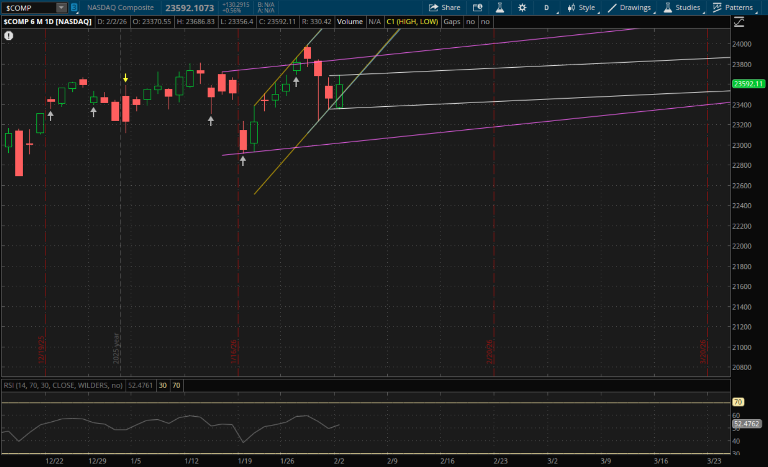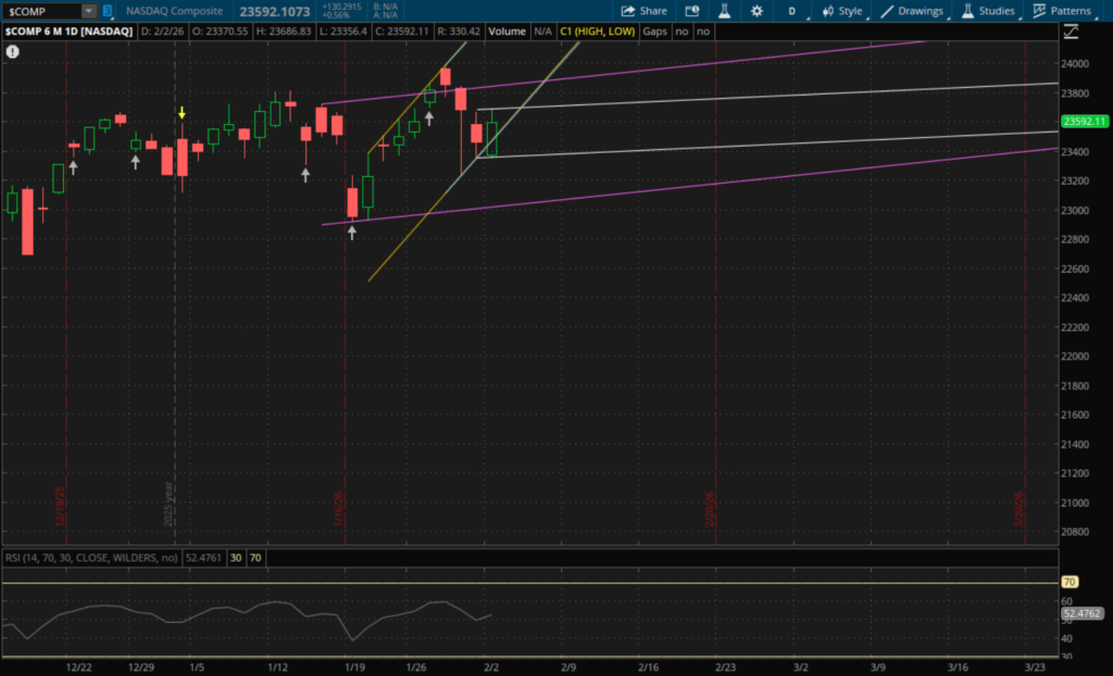 Looking at technical levels for tomorrow, the Nasdaq put in another failed daily breakdown today which now starts a new sideways range for it which is also much smaller than its prior ranges. Its prior uptrend supports are also still valid support/resistances for now and those will be the first levels to watch tomorrow. The 23,590-23,600 level will be support/resistance from both of its prior uptrends that it broke through today (yellow and blue). The Nasdaq closed at 23,592 which is going to be right at this level tomorrow. So it's essentially a toss up whether it opens above or below it tomorrow for those levels to be support or resistance (support if it opens above them and resistance if it opens below). The next resistance level to watch will be at the top of this new sideways range (white) which will be just below 23,700. Support from this same range on a pullback will be at 23,360.