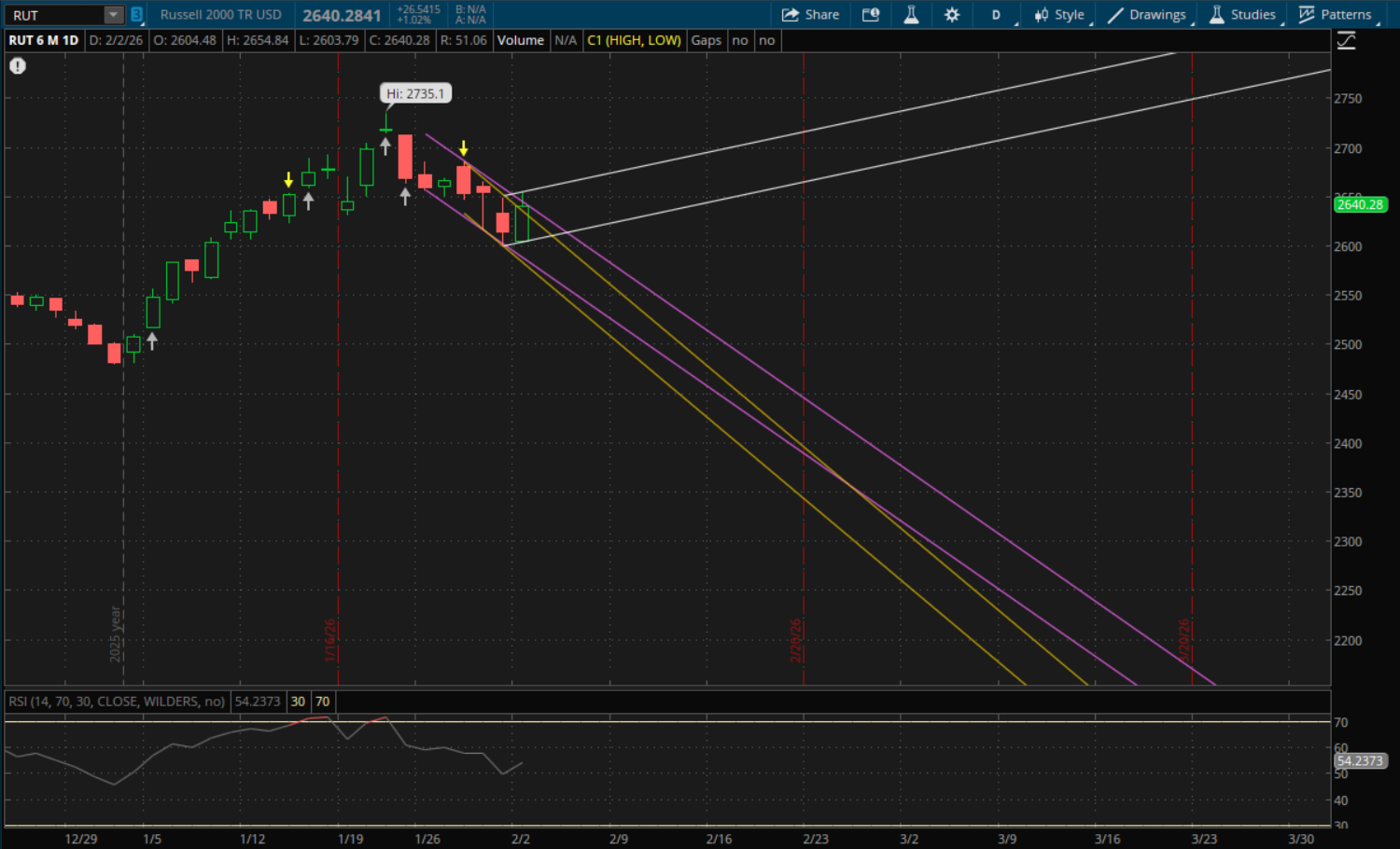 The Russell 2000 broke and closed above its primary downtrend today, this now starts a new uptrend for it going into tomorrow. The prior downtrends will act as support now as long as it doesn't gap back below them. The first support will be at about 2,630 (purple) followed by 2,620 (yellow) which are the two prior downtrends. If those don't hold, then the new uptrend (white) will be support at about 2,608. Meanwhile, resistance to watch will be from its new uptrend at about 2,660.