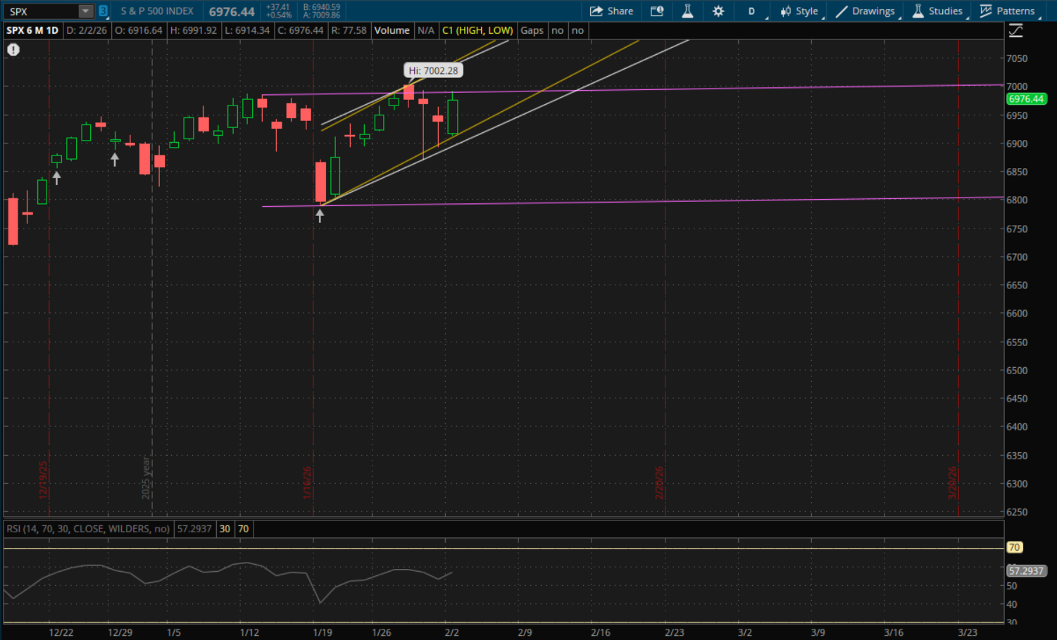 The S&P traded between support and resistance levels that I mentioned in the prior daily update. It didn't break through its primary uptrend support so it does not start any new trends for tomorrow. It held its failed breakdown retest (yellow) at the open again which was around 6,910 today and it also got rejected at its prior sideways channel (purple) around 6,990. Both levels remain valid since it did not clear through either of them. So, resistance will continue to be around this 6,990 level for tomorrow from this same sideways range. Support on a pullback will be at about 6,925 (yellow) from last week's failed breakdown retest as well as 6,905 from it primary uptrend (white).