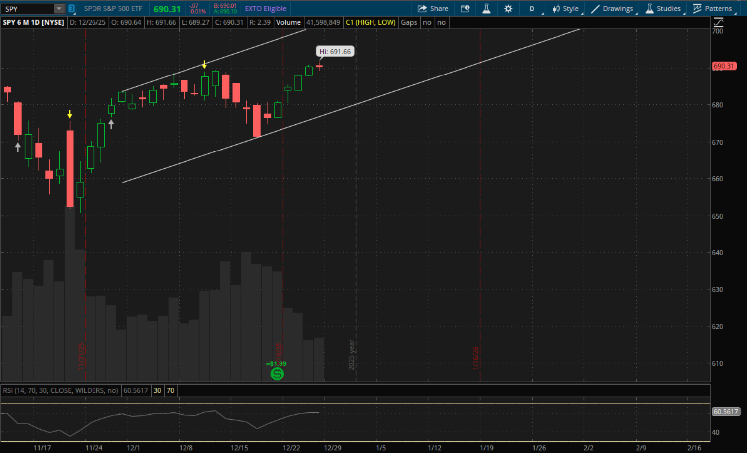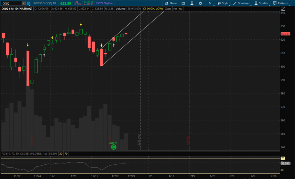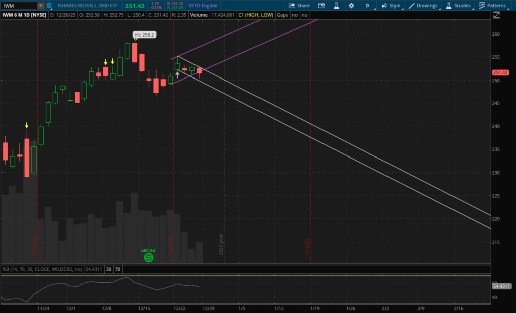 Small caps continued to lag today and IWM closed lower by 0.51% while QQQ and SPY were flat on the day, finishing -0.01% to close out Christmas week. Next week we've got another short holiday week with markets closed on Thursday for New Year's (no half day on New Year's Eve). Next week might be a little busier even with the holiday due to it being the last trading week for 2025.