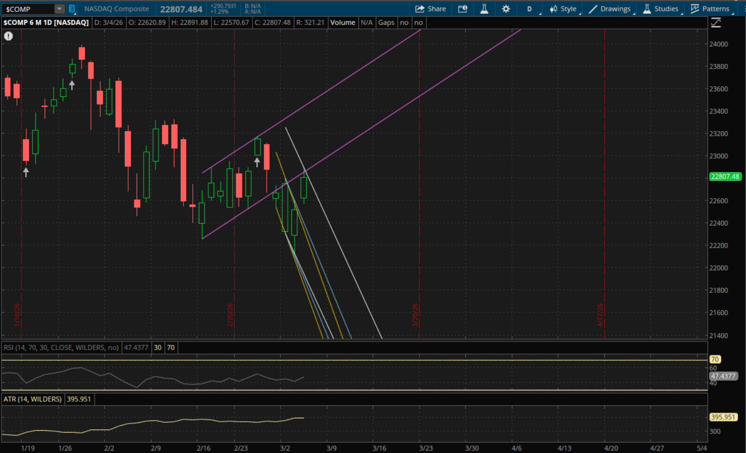 This morning we got a nice gap up in the markets to get them over their prior downtrends. All of the indexes opened and closed above them, but for the Nasdaq it still starts a new downtrend going into tomorrow. Its new, primary downtrend (white), will be at about 22,710 tomorrow which it closed well above today at 22,807. So as long as there's no big gap down below 22,710 tomorrow, this area will act as support on a pullback. If it does gap or break below it and we get a significant sell-off again, the next support to watch will be from its prior downtrend (blue) at 22,200 followed by its next prior downtrend (yellow) at 22,100. If neither of those hold, then its primary downtrend (white) comes into play again at about 21,765 but this would require a pretty big sell-off as it's 4.5% away. If we get a continued bounce, the next resistance for now remains at its prior uptrend (purple) which is at about 22,910. There is also weekly downtrend resistance at about 22,965.