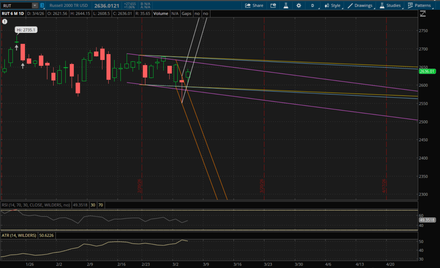 The Russell 2000 also starts a new uptrend with today's break and close above its prior downtrend. But it's in the same situation as the S&P where it needs to see a big gap up tomorrow in order to open above this new uptrend support (white). That level will be at about 2,667 which is about 1.2% away, it's possible but improbable. Odds are it opens below/outside of it in which case that 2,667 area would be resistance on a rally attempt. On the off chance that it does get that big gap up to open above it, or if it breaks through it with a rally, then the next resistance level to watch will be at 2,675-2,676 from both of its prior downtrends (blue and yellow). And in the event of an even larger rally its new uptrend (white) would be resistance at 2,740. However the odds are in favor of an open below this new uptrend, and the next supports to watch on a pullback will be at 2,594-2,595 again from both of its prior downtrends (blue and yellow). After that there would be more support at 2,584 from its purple downtrend. Lastly the 2,532 area would also be support from the downtrend it broke through today (orange) if we were to get another big sell-off.