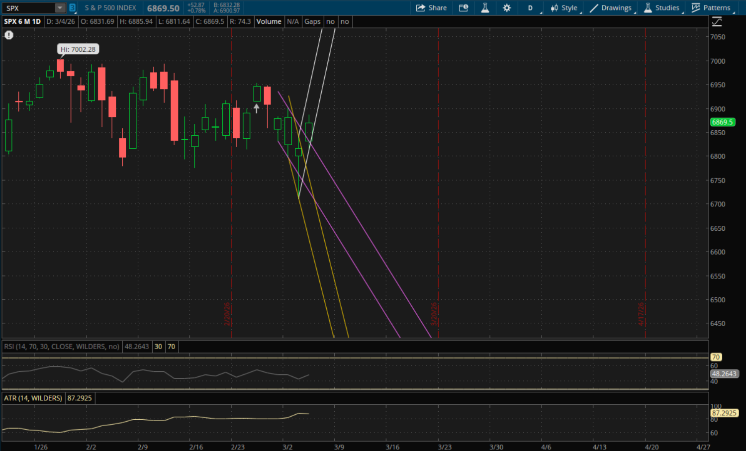 Unlike the Nasdaq, the S&P starts a new uptrend with today's breakout. However, it will need to gap up significantly tomorrow in order to open above this new uptrend (white). That key support/resistance level will be at about 6,915. With today's close of 6,869.50 it will need to gap up almost 0.7% to do that so odds are that it opens below/outside of it in which case it will be resistance on a rally attempt. If it does manage to get that big gap up above it, then it will be support on a pullback. If that happens, the next resistance would be significantly higher above 7,000. The more likely scenario is that it does not open above it and then the next support on a pullback would be from its prior downtrend (purple) at 6,795 with the bottom end of this same range at 6,690 as the next support in the event of another big sell-off.