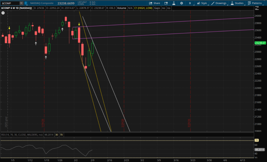 One thing that is notable is that the Nasdaq did open below its weekly retest support (see the weekly update) at about 23,050 this morning. It did break through it, but it still is in a new weekly downtrend with that next big resistance at about 23,535 which will be a big resistance level to watch this week.