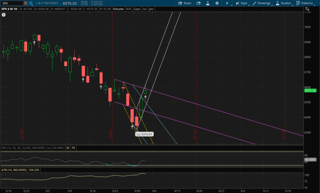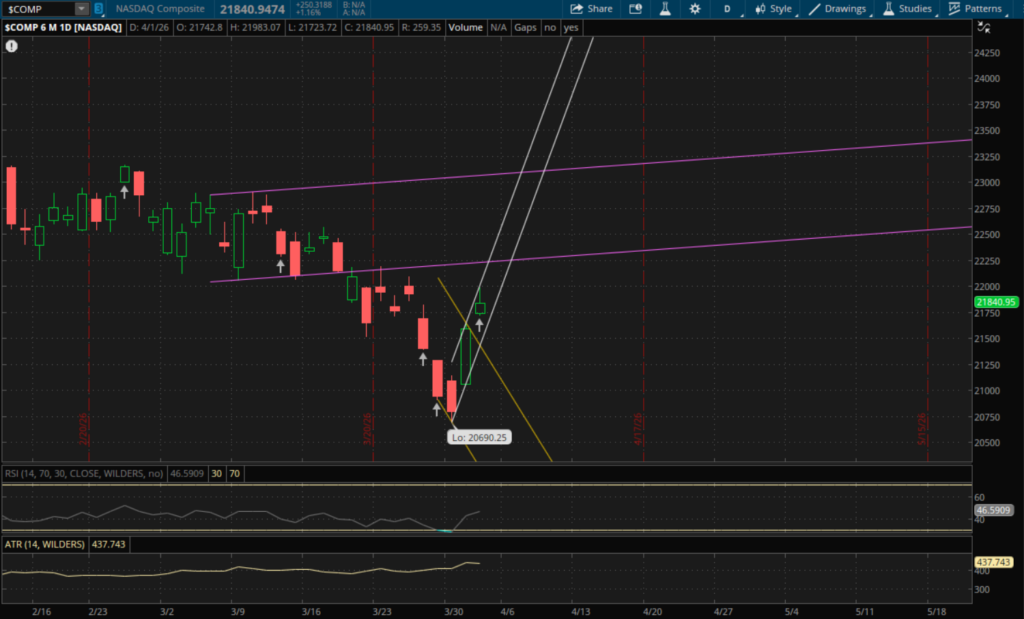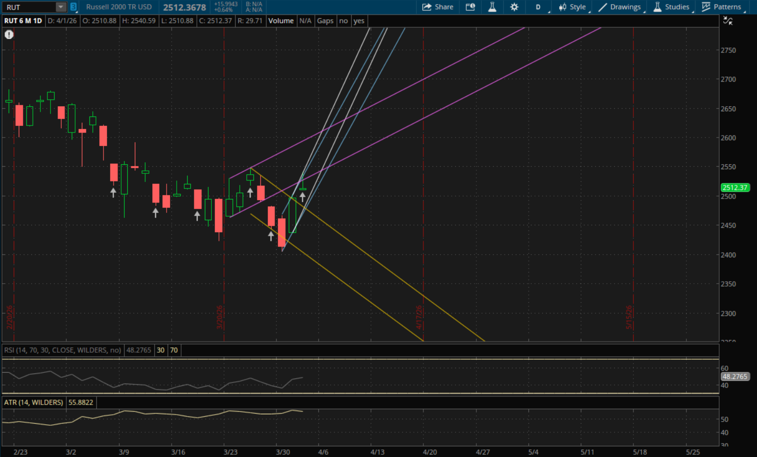 The S&P also started a new uptrend today as it closed above yesterday's primary downtrend. Its new primary uptrend (white) will be support at about 6,556 tomorrow which it's above now as it closed at 6,575 today. So there would need to be about a 0.3% gap lower tomorrow to open below this level. Assuming it does open above it, then that 6,556 level will be the first support to watch. Its prior downtrend (purple) would be the first resistance to watch at about 6,581. It could potentially open above this level as well in which case it would become support. Its last resistance would be from the new primary uptrend which is right around 6,700. If we do get that gap down tomorrow below its primary uptrend at 6,556, then the next support to watch will be from its prior downtrend (blue) at 6,460. After that its purple downtrend would be in play again from the bottom of that range at 6,430.