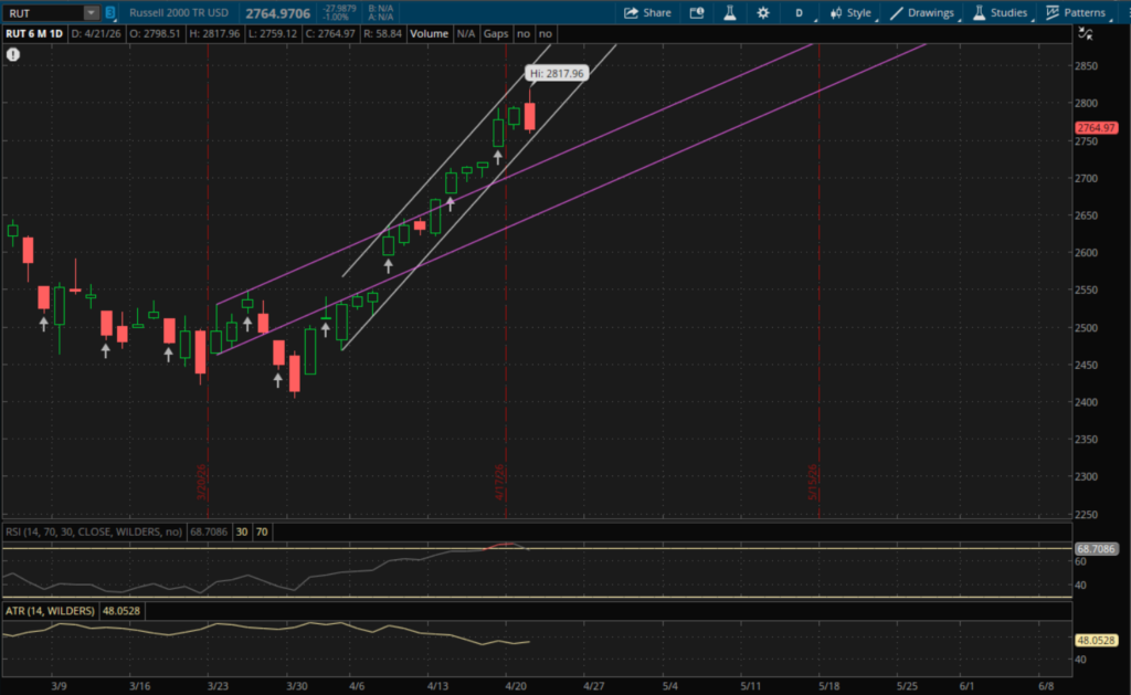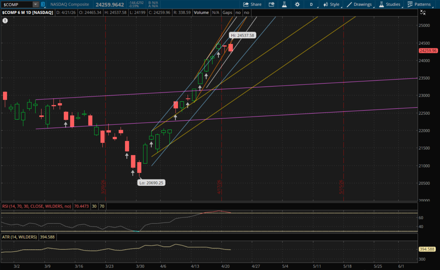 The Nasdaq broke and closed below yesterday's primary uptrend support, but since it has continued to make higher highs, its new trend is still higher. Its new primary uptrend (white) will be at about 24,450 tomorrow which is about 0.8% away from today's close of 24,259. It is possible that the Nasdaq gaps back over it tomorrow morning with the extension of the ceasefire as markets are up after hours. But, if it fails to gap above the 24,450 level then that area will be resistance on a rally attempt. If it can gap back over it, or break through it, the next resistance to watch would be from its prior uptrend (orange) at about 24,800.