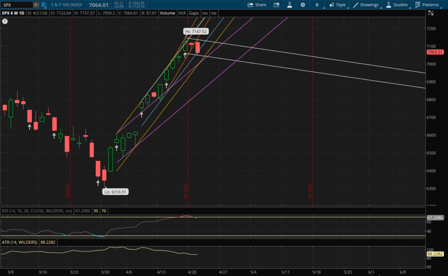 In my weekend update I noted that we would likely get a pullback this week in the S&P to the 7,045-7,050 primary weekly uptrend support. We got there today in the afternoon sell-off as the S&P hit a low of 7,050.20. It didn't break through that weekly support, but it did break through its daily uptrend support and now it starts a new slight downtrend on a daily time frame. One thing to note is that it's already at the bottom of this new daily trend so there is room to bounce in it, especially with the ceasefire extension news after the close.